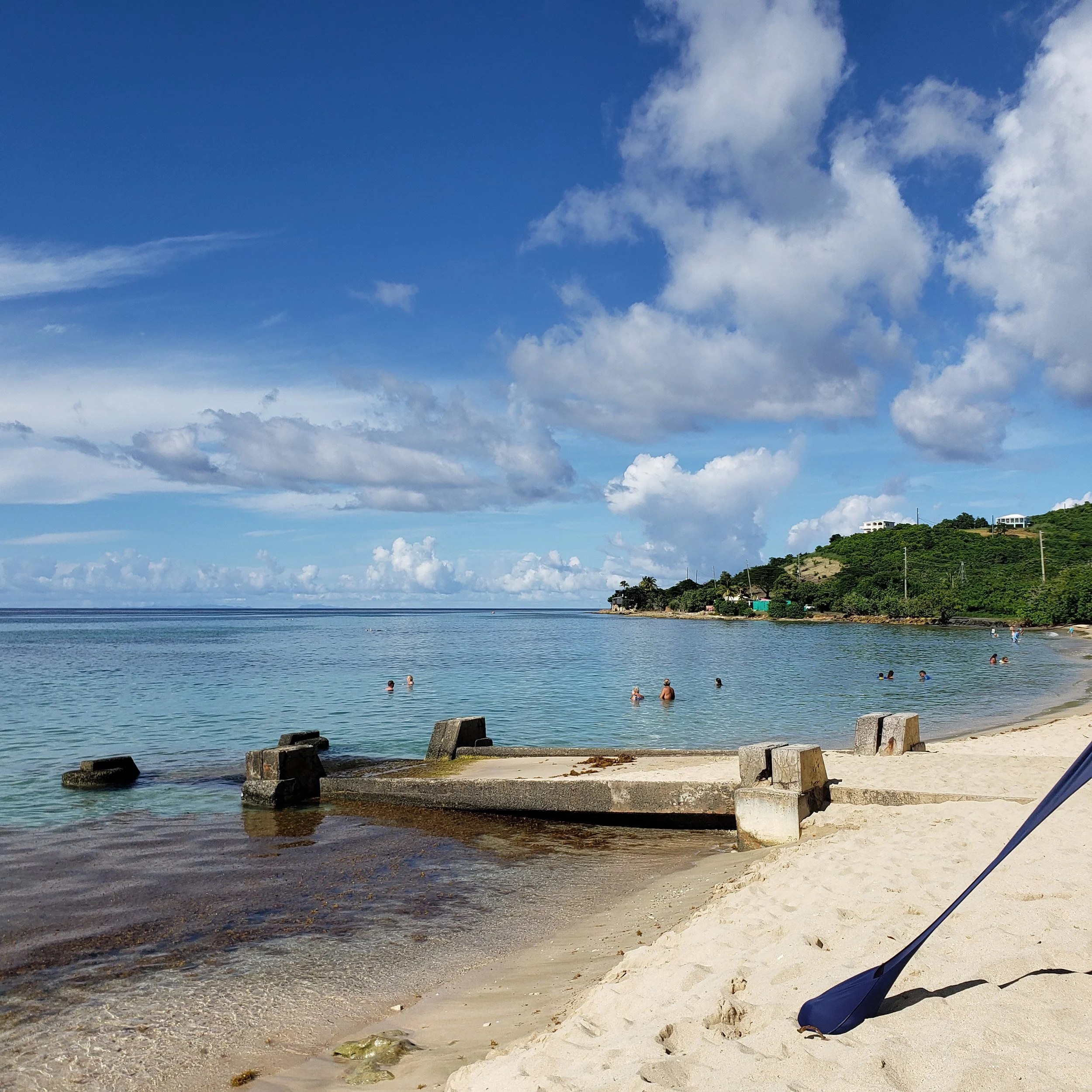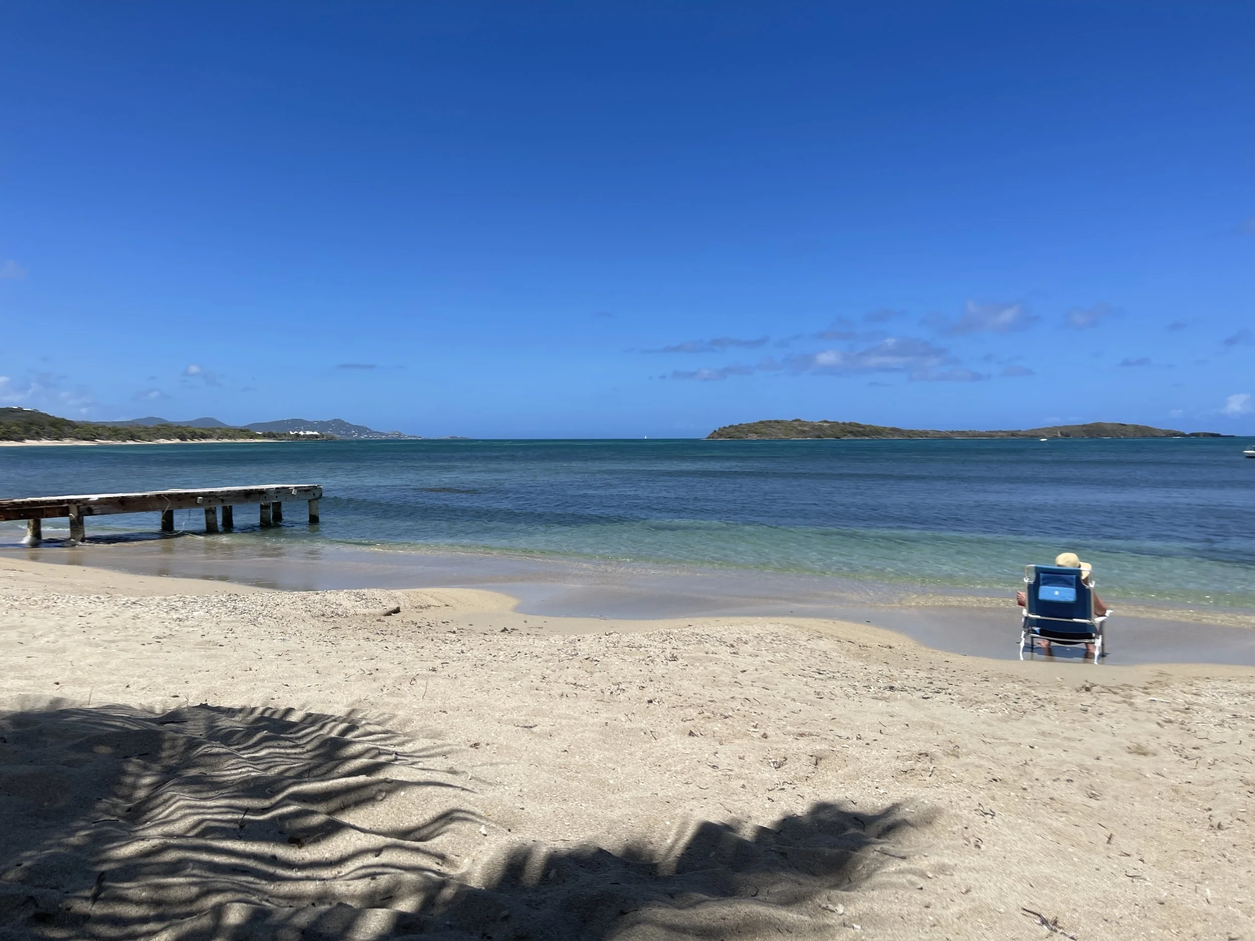 Dorsch - west end, south of Frederiksted. Beautiful water, nice sand. Sandcastles bar/restaurant nearby. If you need to pick up arriving guests at the airport, this beach and Sandy Point are the ultimate cell phone lots. Watch for your guest’s plane to fly overhead, then go get them.