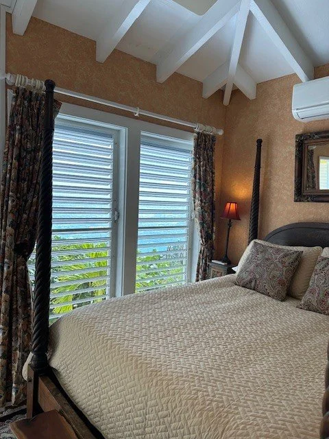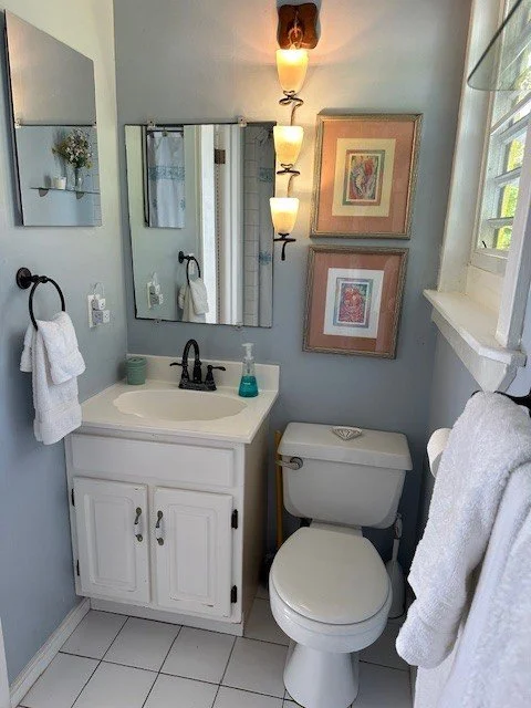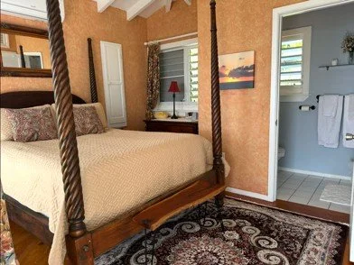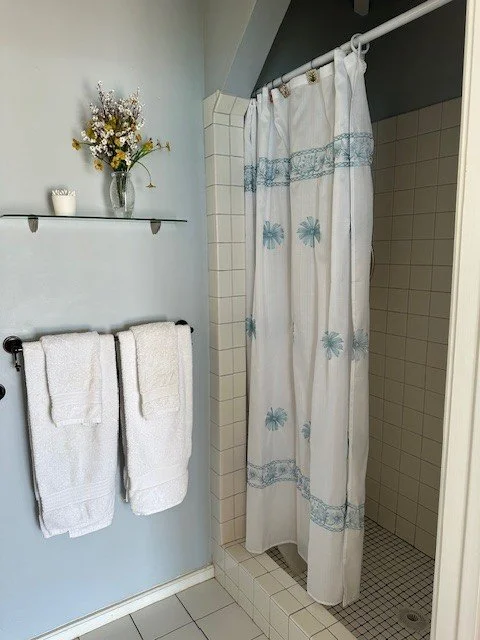 On the upper level in a living space separate from the main living area, The Jewels Suite offers a little more privacy in the most charming room. It features a queen-sized bed, cedar closet, ensuite bath and mini split A/C unit. There is a great view out the front windows.